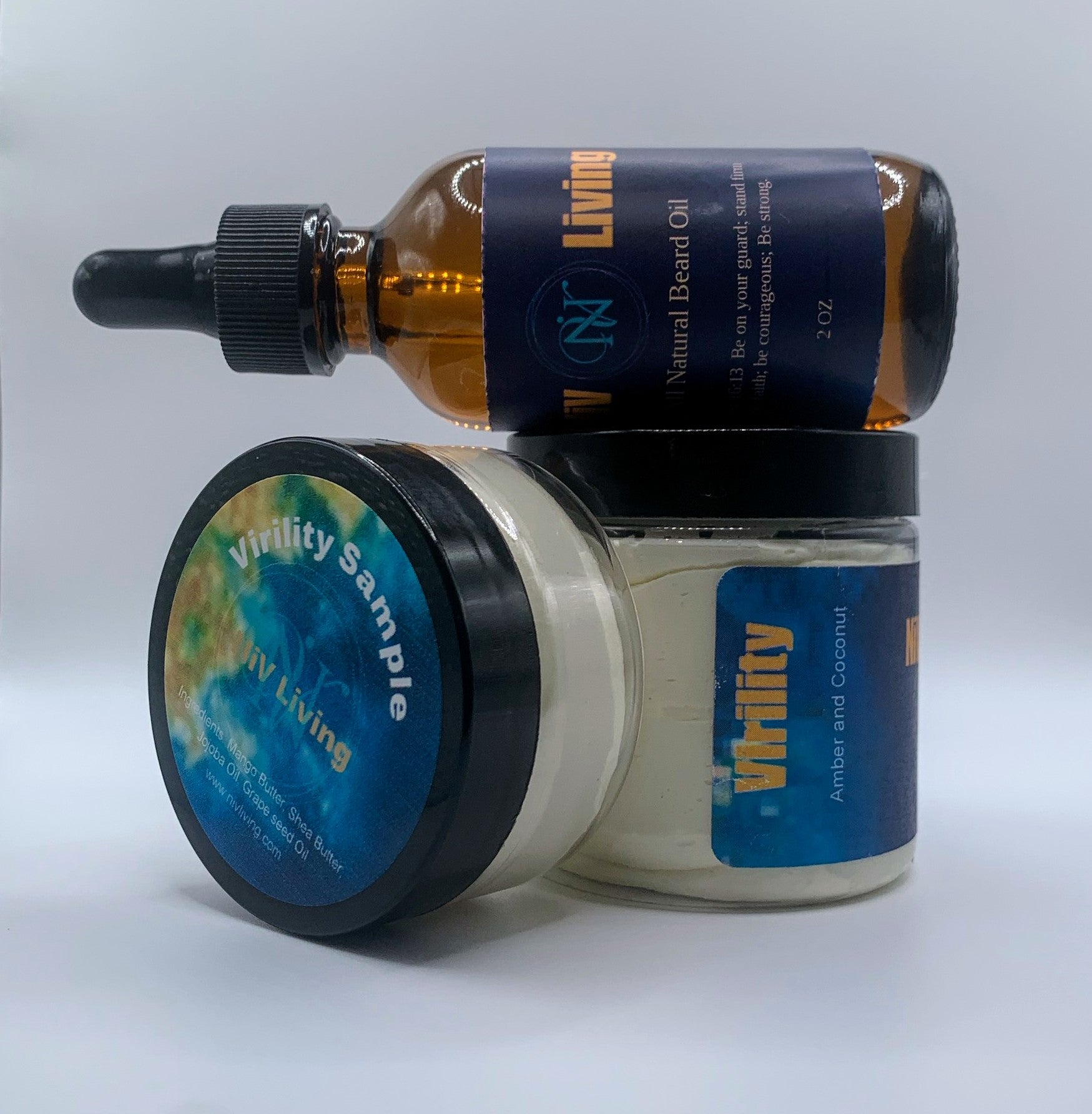 Elevate your grooming ritual with the Virility Trio from NIV Living, a bespoke collection designed to cater to the modern man's skin and beard care needs. This meticulously curated set combines the hydrating power of our Whipped Luxe Crème in both regular and sample sizes with the nourishing essence of our signature Beard Oil. Embrace a regimen that not only enhances your skin's vitality but also tames and refines your beard, infusing it with a manly allure.